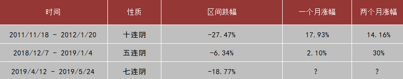 上周市場周一探底后,在稀土、芯片、華為概念等貿(mào)易戰(zhàn)板塊個(gè)股帶領(lǐng)下上破2900點(diǎn),最終由于量能不濟(jì),震蕩回落。最終,上證指數(shù)報(bào)收2852.99點(diǎn),周跌幅-1.02%;深證綜指報(bào)收1496.03點(diǎn),跌-2.43%;創(chuàng)業(yè)板指收1443.75點(diǎn),跌-2.37%。值得一提的是,創(chuàng)業(yè)板指數(shù)周k線七連陰,統(tǒng)計(jì)表明,創(chuàng)業(yè)板歷史上,周k線出現(xiàn)五連陰及以上的情況僅有兩次,無一例外的對應(yīng)了階段性底部區(qū)域。對應(yīng)后續(xù)一個(gè)月及兩個(gè)月的漲幅如下表所示: