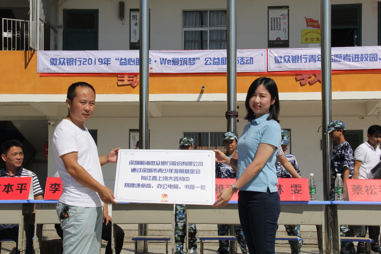 今年9月19日,微眾銀行組織20余名志愿者,前往江西省上饒市鄱陽縣蘆田鄉(xiāng)大吉村大吉中學,開展公益助學活動?;顒訛閷W校捐贈235套課桌椅、12部電腦以及圖書文具衣服等孩子們必須的生活學習物資,切實改善了當?shù)仄D苦的教學條件。同時,微眾銀行的員工還發(fā)揮自己所長,為當?shù)氐暮⒆觽冮_設了數(shù)學課、金融普及課、英語沙龍和趣味體育等課程,希望幫助他們開闊眼界、愛上學習。朗朗的讀書聲、求知若渴的眼神,微眾銀行就是這樣用自己的實際行動,為貧困地區(qū)的青少年兒童插上了夢想的翅膀,助力他們迎風飛翔。
