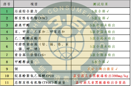 報(bào)告顯示,本次比較試驗(yàn)中分別測試“兒童漆”以及“藝術(shù)涂料”兩個(gè)大類。在兒童內(nèi)墻漆測試中(以下簡稱兒童漆)測試標(biāo)準(zhǔn)為GB/T43676-2017《兒童房裝飾用內(nèi)墻涂料》及JG/T481-2015《低揮發(fā)性有機(jī)化合物(VOC)水性內(nèi)墻涂覆材料》,各項(xiàng)依據(jù)上述兩個(gè)標(biāo)準(zhǔn)中最嚴(yán)要求進(jìn)行測試、判定;通過測試5款兒童漆評(píng)出5星產(chǎn)品1款,4星產(chǎn)品3款;其中,嘉寶莉兒童智繪黑板漆檢出禁用物質(zhì)烷基酚聚氧乙烯醚(APEO),檢測結(jié)果總揮發(fā)性有機(jī)化合物(TVOC)含量較高(以下簡稱APEO、TVOC)。結(jié)論顯示,兒童漆的環(huán)保性能不是越貴越好,美涂士寶寶健康星兒童房專用漆性價(jià)比較高。