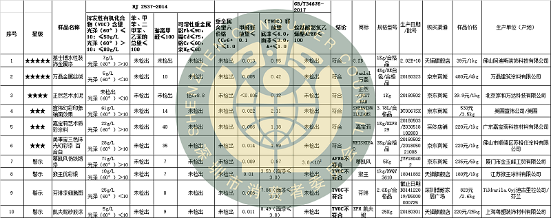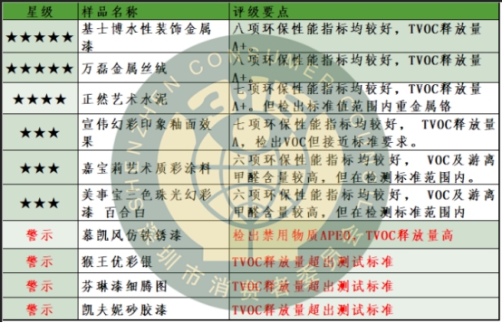 而在藝術(shù)涂料的測試中,以中國的十環(huán)認(rèn)證標(biāo)準(zhǔn)HJ2537-2014《環(huán)境標(biāo)志產(chǎn)品技術(shù)要求 水性涂料》及JG/T481-2015《低揮發(fā)性有機(jī)化合物(VOC)水性內(nèi)墻涂覆材料》為測試藍(lán)本,在選取測試的10款內(nèi)墻藝術(shù)涂料評(píng)出5星產(chǎn)品2款,4星產(chǎn)品1款,3星產(chǎn)品3款;其中慕凱風(fēng)鐵銹藝術(shù)漆檢出禁用物質(zhì)(APEO);猴王AC優(yōu)彩銀、凱夫妮仿砂巖漆及芬琳細(xì)騰圖漆3款樣品TVOC釋放量超出標(biāo)準(zhǔn)要求,后兩款超出標(biāo)準(zhǔn)限值2倍多。測試結(jié)果顯示,金屬質(zhì)感、珠光效果、砂巖效果、鐵銹效果等不同材質(zhì)和效果的藝術(shù)涂料環(huán)保性能無明顯區(qū)別。