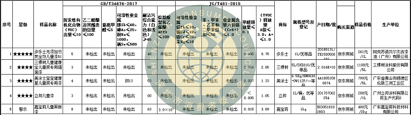附表1 :兒童漆產(chǎn)品信息及評(píng)級(jí)表