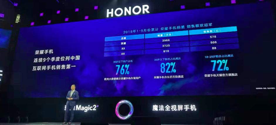 2018年,在全球智能手機(jī)市場(chǎng)增長(zhǎng)遇冷的大勢(shì)下,榮耀繼續(xù)乘風(fēng)破浪的亮眼表現(xiàn)。在國(guó)內(nèi)市場(chǎng),連續(xù)9個(gè)季度位列中國(guó)互聯(lián)網(wǎng)手機(jī)銷售第一,進(jìn)一步夯實(shí)互聯(lián)網(wǎng)手機(jī)第一品牌的地位。據(jù)賽諾數(shù)據(jù)顯示,2018年1-9月,榮耀手機(jī)以3966萬(wàn)臺(tái)的銷量、578億元的銷售額,雙雙進(jìn)入中國(guó)手機(jī)市場(chǎng)的前五,這也是唯一入圍TOP5的互聯(lián)網(wǎng)手機(jī)品牌。同時(shí),榮耀在全球74個(gè)國(guó)家市場(chǎng)以榮耀模式縱深布局、深度耕耘,強(qiáng)勢(shì)進(jìn)入快速增長(zhǎng)通道。