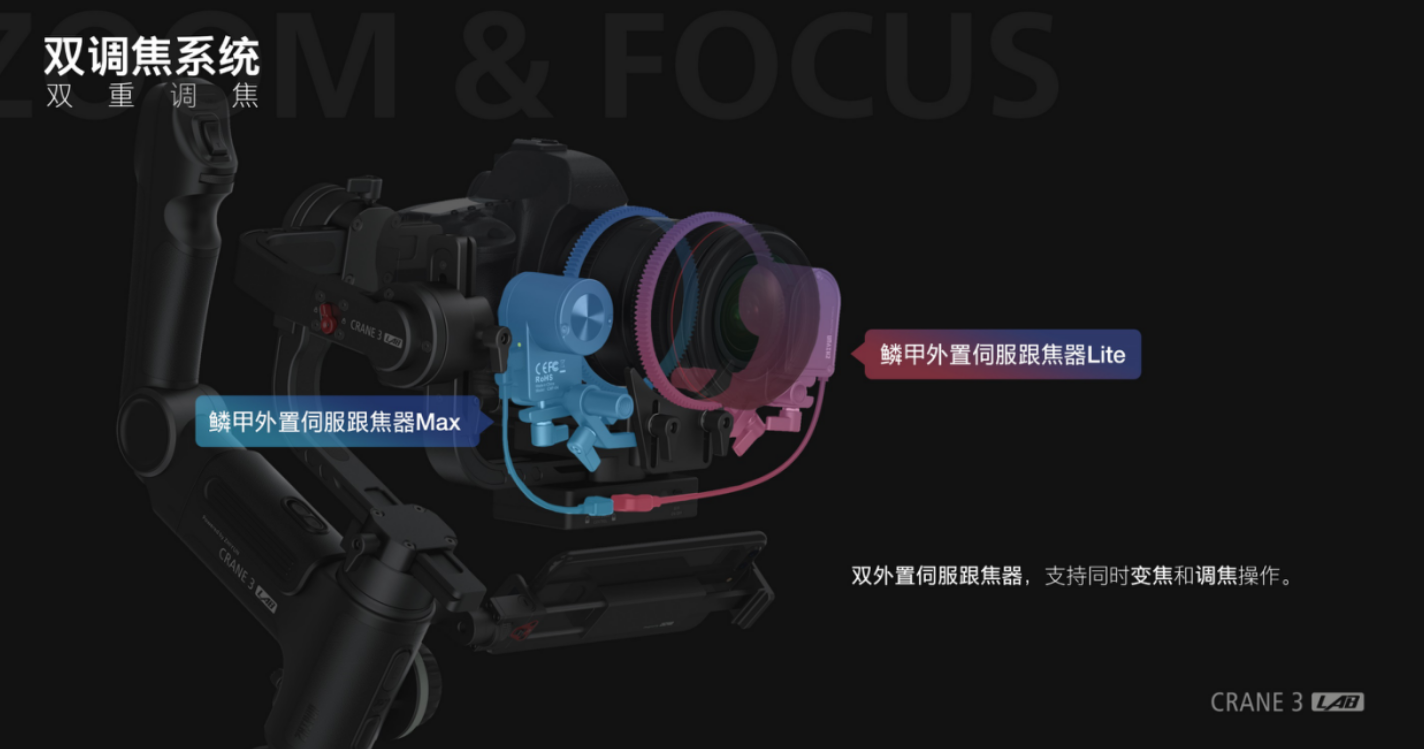 云鶴3 LAB可搭載雙外置伺服跟焦器,支持變焦和跟焦同時(shí)操作。傳統(tǒng)電子跟焦精度低,延遲高,只能兼容特定品牌的相機(jī)加鏡頭,調(diào)焦不順滑;外置伺服跟焦高精度,無(wú)延遲,對(duì)相機(jī)和鏡頭無(wú)特殊要求,調(diào)焦順滑。雙外置伺服跟焦高精度,無(wú)延遲,對(duì)相機(jī)和鏡頭無(wú)特殊要求,跟焦、變焦順滑,支持同時(shí)操作。既可以通過(guò)機(jī)器上的跟焦手輪和船型按鍵控制調(diào)焦和變焦,也可以通過(guò)ViaTouch在手機(jī)屏幕上直接控制調(diào)焦和變焦。