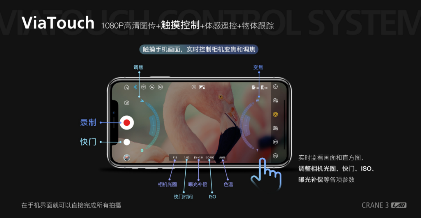 全新的ViaTouch交互功能:云鶴3 LAB搭載旗艦無(wú)線圖傳系統(tǒng),最高支持1080P的分辨率,手機(jī)、平板都能成為單反監(jiān)視屏,實(shí)時(shí)監(jiān)看畫(huà)面構(gòu)圖和各項(xiàng)參數(shù)。在手機(jī)界面就可以直接完成所有拍攝;還能實(shí)時(shí)監(jiān)看畫(huà)面和直方圖,調(diào)整相機(jī)光圈、快門、ISO、曝光補(bǔ)償?shù)雀黜?xiàng)參數(shù)。觸摸手機(jī)畫(huà)面,實(shí)時(shí)控制相機(jī)變焦和調(diào)焦。取下作為監(jiān)視器的手機(jī),即可變身成為一臺(tái)體感遙控器,一機(jī)兩用。在手機(jī)中框選住想要追蹤的物體,穩(wěn)定器就會(huì)控制相機(jī)自動(dòng)跟隨物體進(jìn)行拍攝。