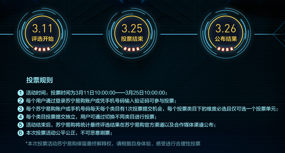 3月11日用戶投票評(píng)選開始,3月25日投票結(jié)束,26日正式公布投票結(jié)果,活動(dòng)貫穿蘇寧易購315全民煥新節(jié)期間,面對(duì)眾多手機(jī)、電腦、數(shù)碼新品,用戶會(huì)作何選擇?