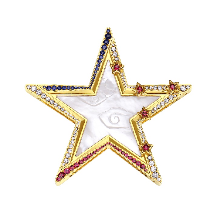 作為本次發(fā)布會主角,周大福17916系列新品“宸”曾作為第11屆“法國圣埃蒂安國際設(shè)計雙年展”參展作品,在世界舞臺上綻放過光芒?!拔褰切恰钡脑煨腿谌肓朔▏鴩焖{(lán)、白、紅三色和中國國旗的五角星元素,代表了中法兩國的交流與合作,雙方希望通過宸這樣意義深遠(yuǎn)的產(chǎn)品,見證和促進(jìn)兩國的和平發(fā)展與經(jīng)濟(jì)交流?!板贰币员睒O星為靈感來源,寓意點亮年輕人的生活與夢想。別具一格的五角星設(shè)計藝術(shù)感十足,鉆石與22K金的加持,更讓整個作品展現(xiàn)出奪目光彩。白貝母項鏈外圈圍以鉆石、寶石,一款三戴,幻化無限魅力。簡潔的五角星造型,干凈有力,猶如夜空中指引前行的明星。