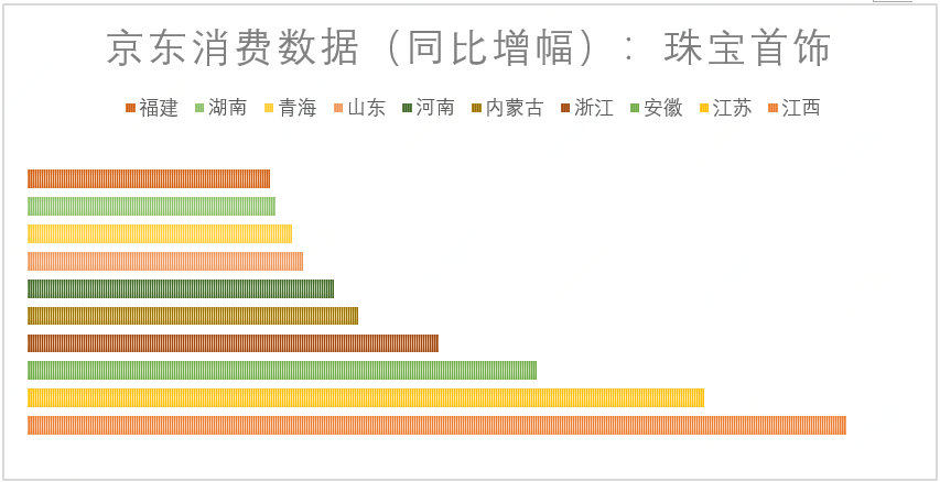 而在珠寶首飾的需求上,東南省份再次成為消費主力軍,其中江西省的同比增幅達(dá)到300%以上,看來在江西的小伙伴今年國慶期間可沒少參加婚禮。