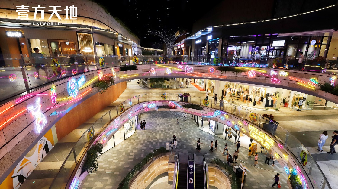 “顏值是第一生產(chǎn)力”,要打造夜間標(biāo)桿,氛圍營(yíng)造必不可少。壹方天地將燈飾與建筑、綠植等多個(gè)元素巧妙結(jié)合,璀璨的景觀燈、夢(mèng)幻的星星燈、妙趣橫生的IP主題霓虹燈烘托出獨(dú)具一格的藝術(shù)氛圍。夜晚時(shí)分搭配噴泉秀和噴霧,光影夢(mèng)幻,玉壺光轉(zhuǎn),營(yíng)造出極富層次感的夜景。同時(shí),通過(guò)加強(qiáng)外圍的燈光照明等,持續(xù)亮化夜間氛圍,壹方天地成為夜間休閑、聚會(huì)的絕佳場(chǎng)所。“消費(fèi)者沒(méi)事也喜歡來(lái)走一走,享受工作之余的休閑時(shí)光。”潘燦峰說(shuō)道。