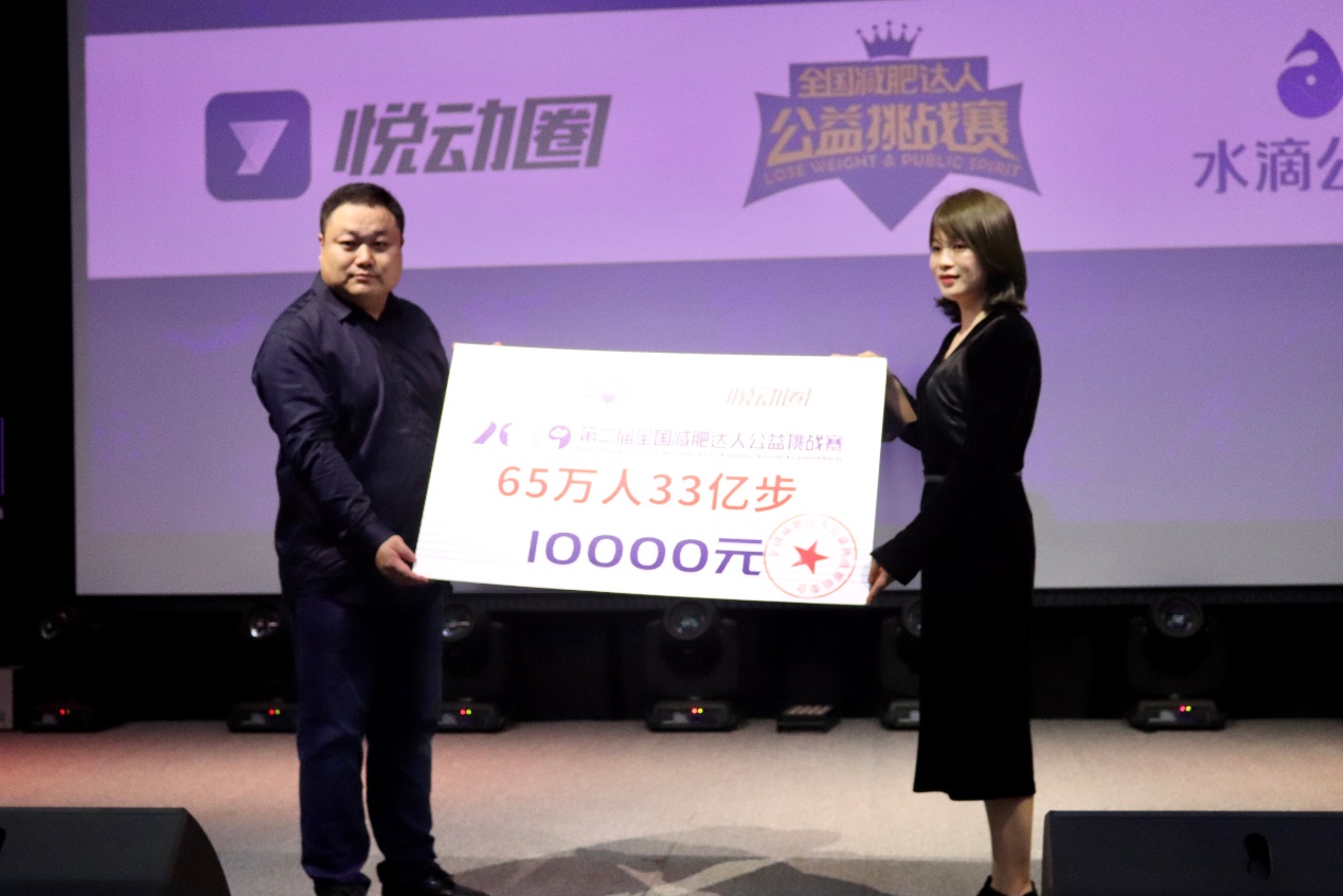 典禮上賽事組委會(huì)還履行“一斤脂肪,一元愛心”的賽事公益承諾,在頒獎(jiǎng)典禮上舉行了隆重的賽事公益金捐贈(zèng)儀式。賽事最終公益金累計(jì)20389元(其中本屆賽事累計(jì)減重10389斤,悅動(dòng)圈平臺(tái)累計(jì)65萬人線上參與步數(shù)捐贈(zèng)活動(dòng)),公益金將如數(shù)捐獻(xiàn)于賽事公益合作伙伴——水滴公益匯聚基金會(huì),由水滴公益將賽事公益金致力于“心愿清單”圓夢(mèng)山區(qū)兒童校園體育夢(mèng)想計(jì)劃。