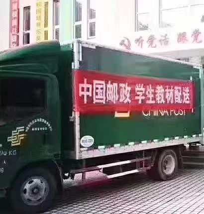 沉重的數(shù)百捆新教材,封面眼花繚亂的各類課本、練習本、光碟,最后都在工作人員的手下,變成一個個方方正正的包裹,靜靜地等待著一輛輛綠色的郵車駛來,把他們傳遞到小主人的手上。