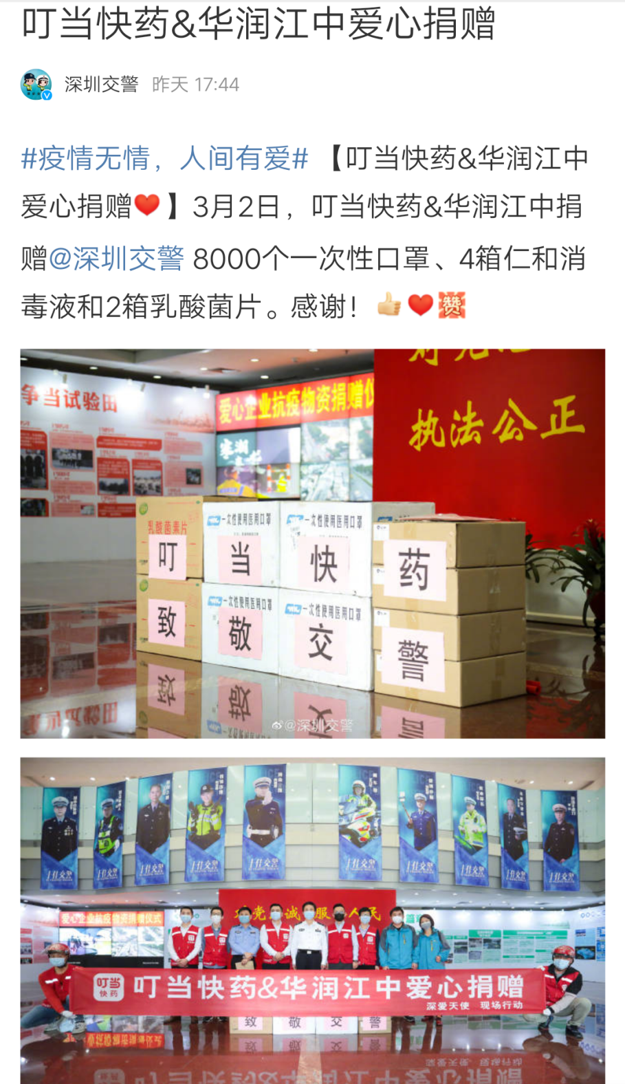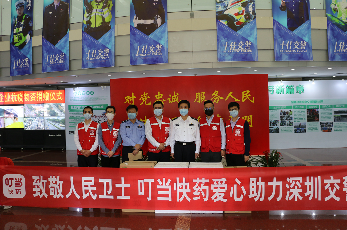 3月2日下午,深圳叮當快藥負責人來到深圳市福田區(qū)蓮花支路的市交警局,他們帶來了8000個口罩、4箱消毒液和2箱乳酸菌片,前來迎接的市交警局局領導對叮當快藥的愛心舉措表示感謝。