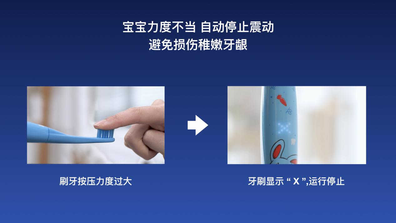 S7000K智能音樂兒童電動牙刷還支持自動過壓降頻保護(hù),當(dāng)孩子在刷牙力度過大時(shí),該功能就會啟動,自動停止振動,屏幕LED還會顯示出X型警告,保護(hù)孩子稚嫩的牙齦及牙釉質(zhì)。