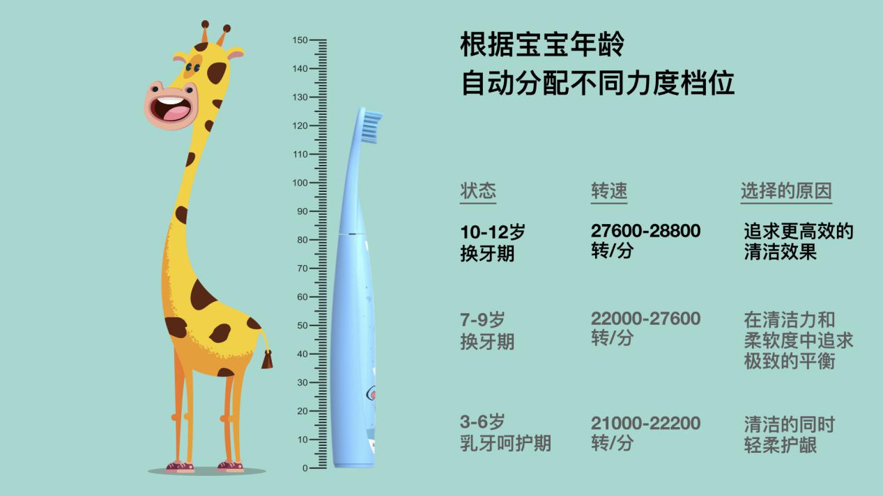 根據(jù)孩子的乳牙期、換牙期以及相應(yīng)年齡段特點(diǎn),S7000K可以自動分配不同的轉(zhuǎn)速力度檔位功能,分階呵護(hù),讓孩子刷牙放心無憂。
