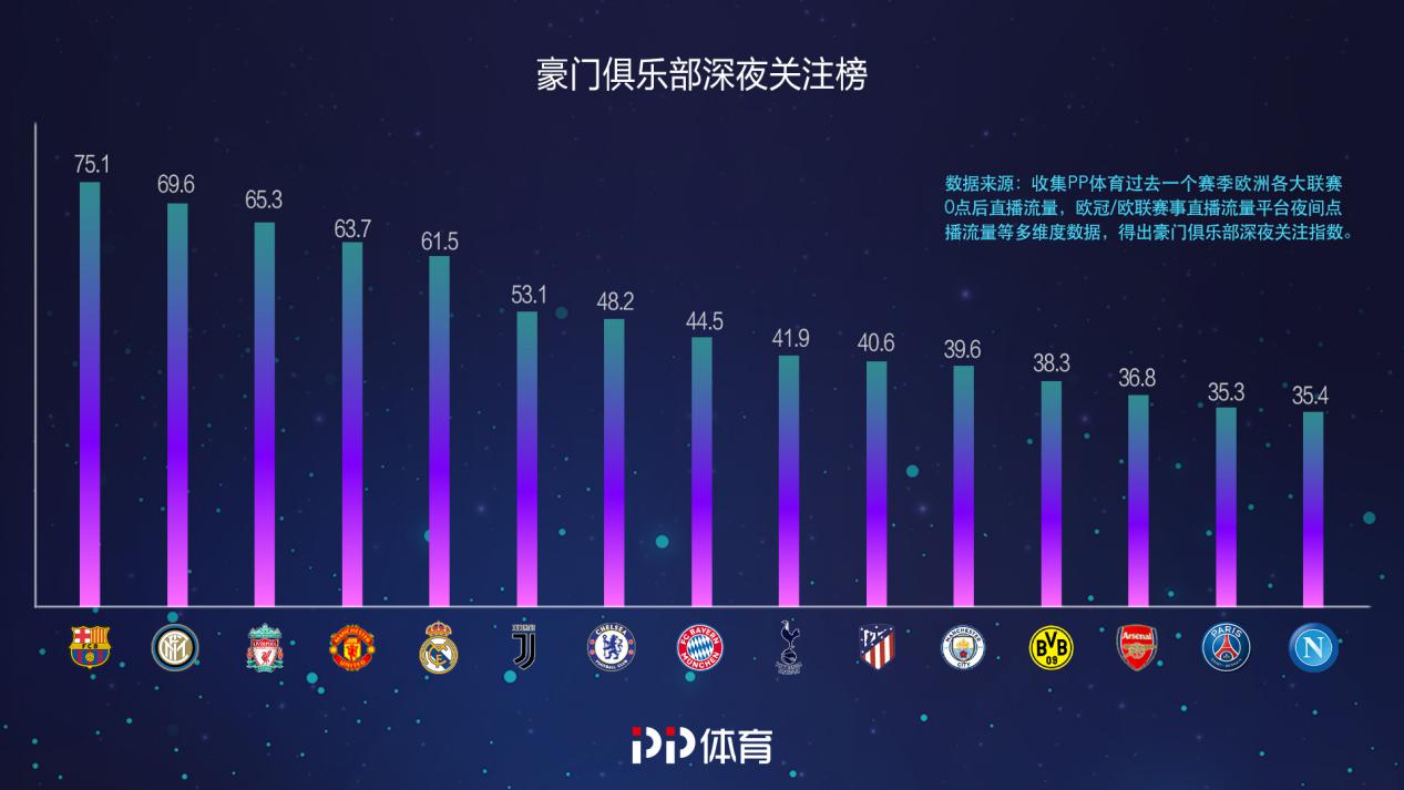 而哪些豪門俱樂部讓球迷甘心奉獻出黑眼圈呢?《球迷深夜觀賽報告》也給出了答案,巴薩、國際米蘭、利物浦位列深夜關(guān)注指數(shù)前三名,巴薩和利物浦因為各自影響力和聯(lián)賽表現(xiàn)進入前三名,國米則憑借在意甲前半程的強勢崛起,以及與巴薩的歐冠焦點戰(zhàn)、與尤文的意大利國家德比等焦點賽事,強勢進入榜單前三。曼聯(lián)、皇馬、尤文、切爾西、拜仁均進入前十。