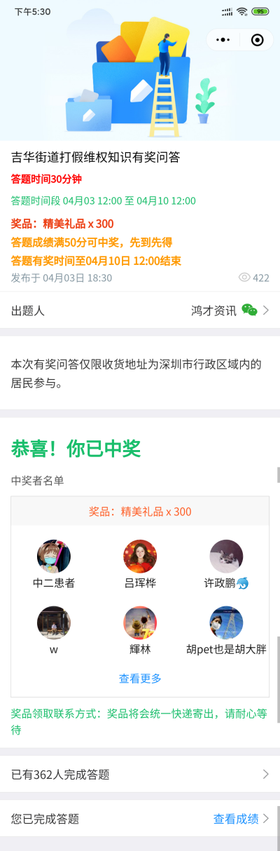 見圳客戶端·深圳新聞網(wǎng)2020年4月14日訊 近日,吉華街道經(jīng)科辦組織開展的消費(fèi)者打假維權(quán)有獎(jiǎng)問答活動(dòng)圓滿結(jié)束。此次活動(dòng)通過轄區(qū)內(nèi)各園區(qū)及各社區(qū)居民小組微信群廣泛宣傳,覆蓋近萬名轄區(qū)居民。