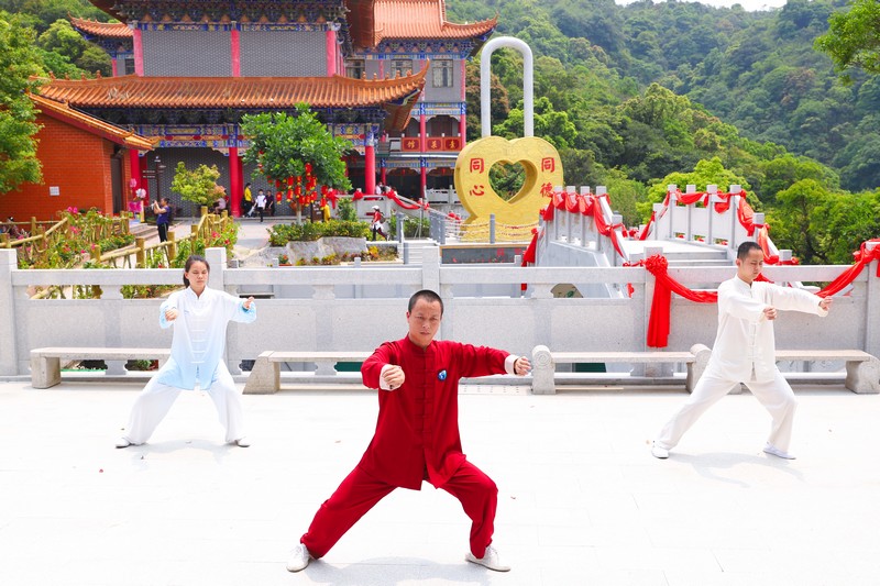 登上山巔,鴻幅祥瑞的天下第一福前,群體太極隨著古曲起勢,他們動作輕盈、身形矯健,把太極拳柔韌纏絲、松活彈抖的節(jié)奏美和力量美表現(xiàn)得淋漓盡致,不少觀眾看到太極拳展示都拍手叫好。在綿延而伸的三寶路、清幽靜謐的雅清苑、吉祥苑的亭臺小榭中,太極習練者在樹影搖曳、微風徐徐的自然中站立,悠揚的古曲似流水緩緩流灑,一個個飄飄然的身影沉肩墜肘、輾轉(zhuǎn)騰挪,在一呼一吸的節(jié)奏中,不知不覺便將心沉浸在山水交融、天人合一的境界中。此外,更有小萌娃著太極服現(xiàn)場“過招”,“大展拳腳”,與身邊青翠風景相映成畫,圍觀游客紛紛用手機留下這圈粉的身影。其中一位家長介紹,小朋友從小和爺爺學習太極,為了強身健體,也是興趣使然,觀音山森林環(huán)境良好,久宅在家?guī)Ш⒆幼叱黾议T打打太極,呼吸新鮮空氣,有益身心狀態(tài)的調(diào)節(jié)。