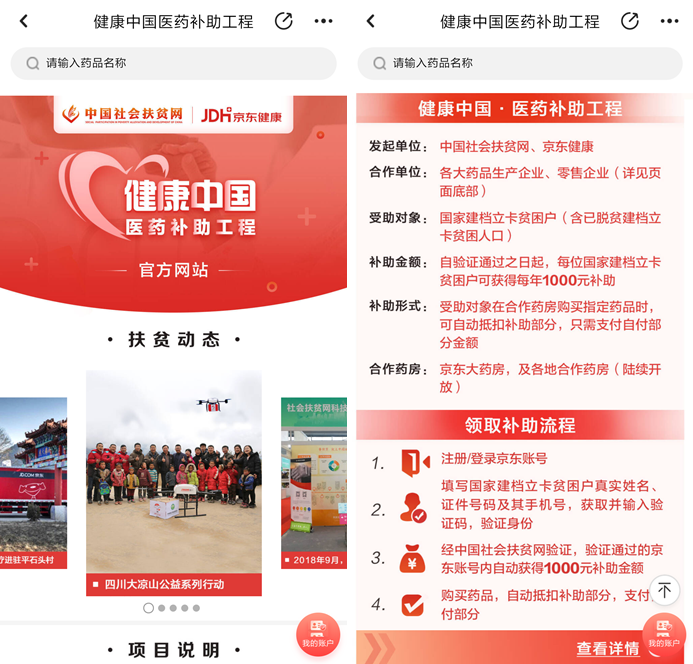 在中國扶貧志愿服務(wù)促進會指導下,依托中國社會扶貧網(wǎng),“健康中國?醫(yī)藥補助工程”將對全國貧困人口身份信息精準識別,確定受助對象,京東健康將為受助對象每人每年提供1000元藥品補助資金,受助對象在指定渠道購買補助目錄內(nèi)藥品時即可使用。