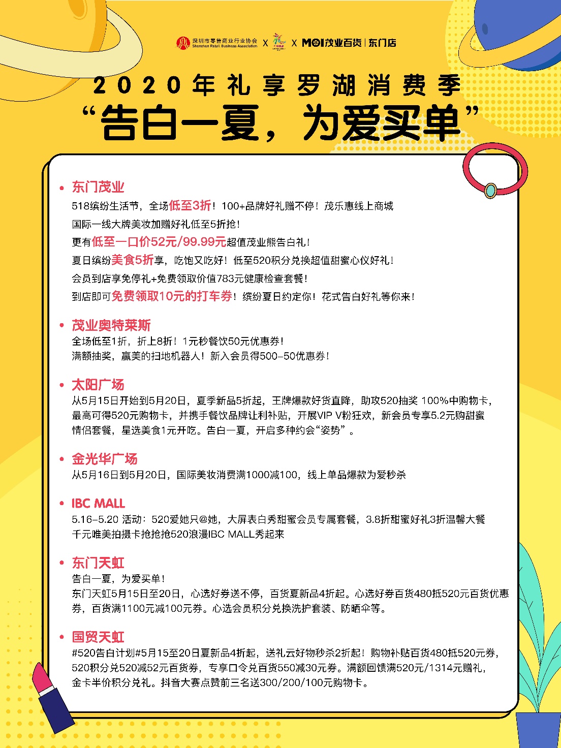 本次活動(dòng)在深圳市零售商業(yè)行業(yè)協(xié)會(huì)的組織下,聯(lián)合東門茂業(yè)、茂業(yè)奧特萊斯、太陽(yáng)百貨、金光華廣場(chǎng)、IBC MALL,天虹等商家共同開展。