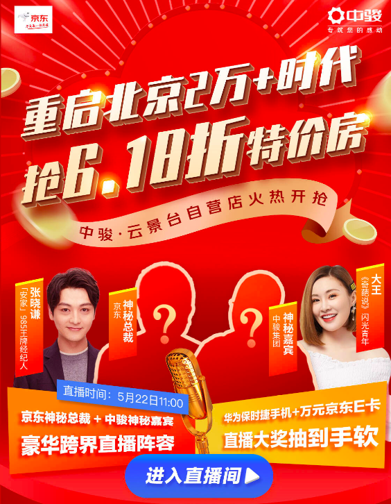 值得關(guān)注的是,中國(guó)內(nèi)地男演員張曉謙、奇葩說(shuō)選手大王、以及京東和中駿的兩位“神秘嘉賓”還將在5月22日上午11點(diǎn)帶來(lái)直播,在線預(yù)售全新房源,并將一套6.18折的特價(jià)房開(kāi)展618抽獎(jiǎng)活動(dòng),優(yōu)惠后僅需一百多萬(wàn)元即可拿下一套北京新房。