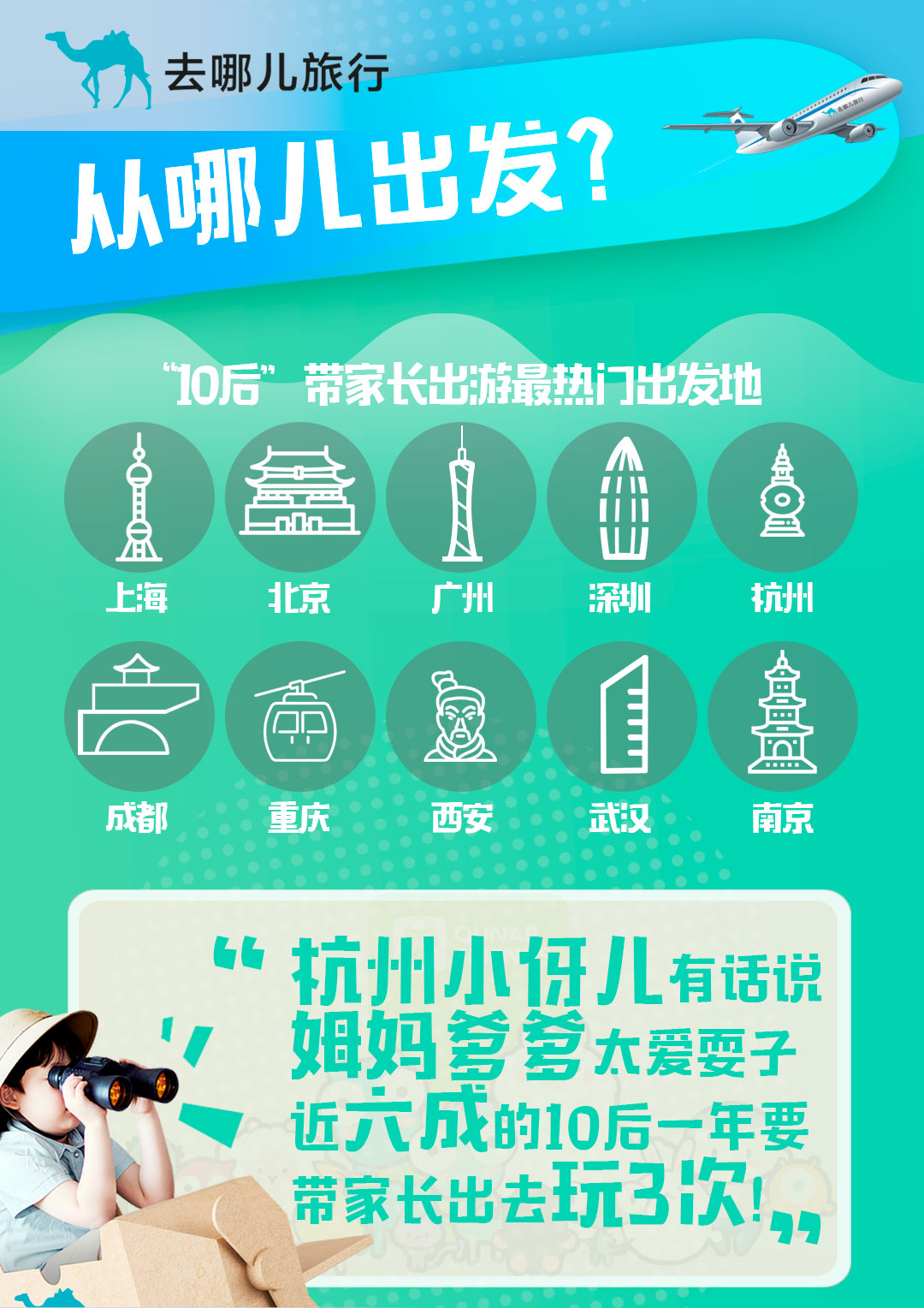 在去哪兒網(wǎng)平臺(tái)上,已有近半數(shù)家庭,一年親子游超3次,深圳位列最愛(ài)玩城市,六成“10后”年均帶家長(zhǎng)出游超3次;雖然熱門(mén)目的地還是“北上廣”,但是在“10后”的悉心指導(dǎo)下,這屆家長(zhǎng)有了新的玩法。