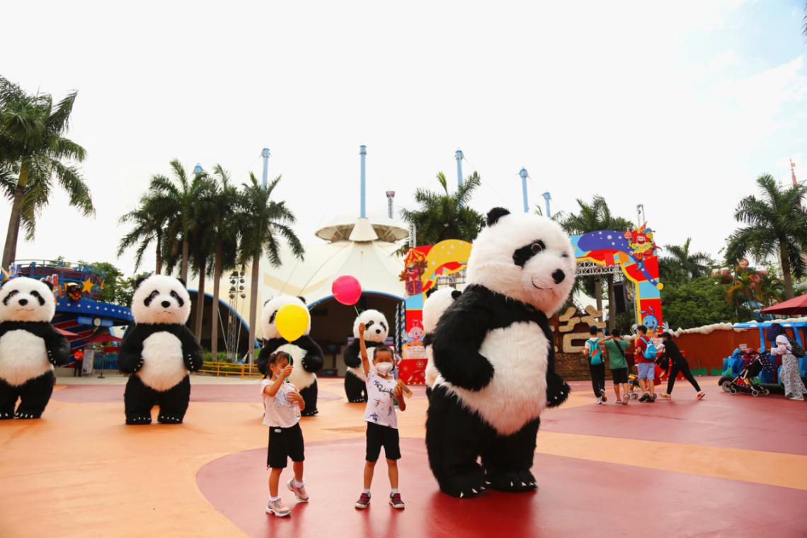 眾多戶(hù)外兒童項(xiàng)目備受親子客群青睞。夢(mèng)幻泡泡、氣球表演更是引得小朋友們尖叫互動(dòng),拿著各色花式氣球,追逐著用繩索揮舞出的巨大彩色泡泡。10只2.5米高的熊貓玩偶、花車(chē)巡游吸引了眾多家庭游客駐足欣賞、拍照留念。