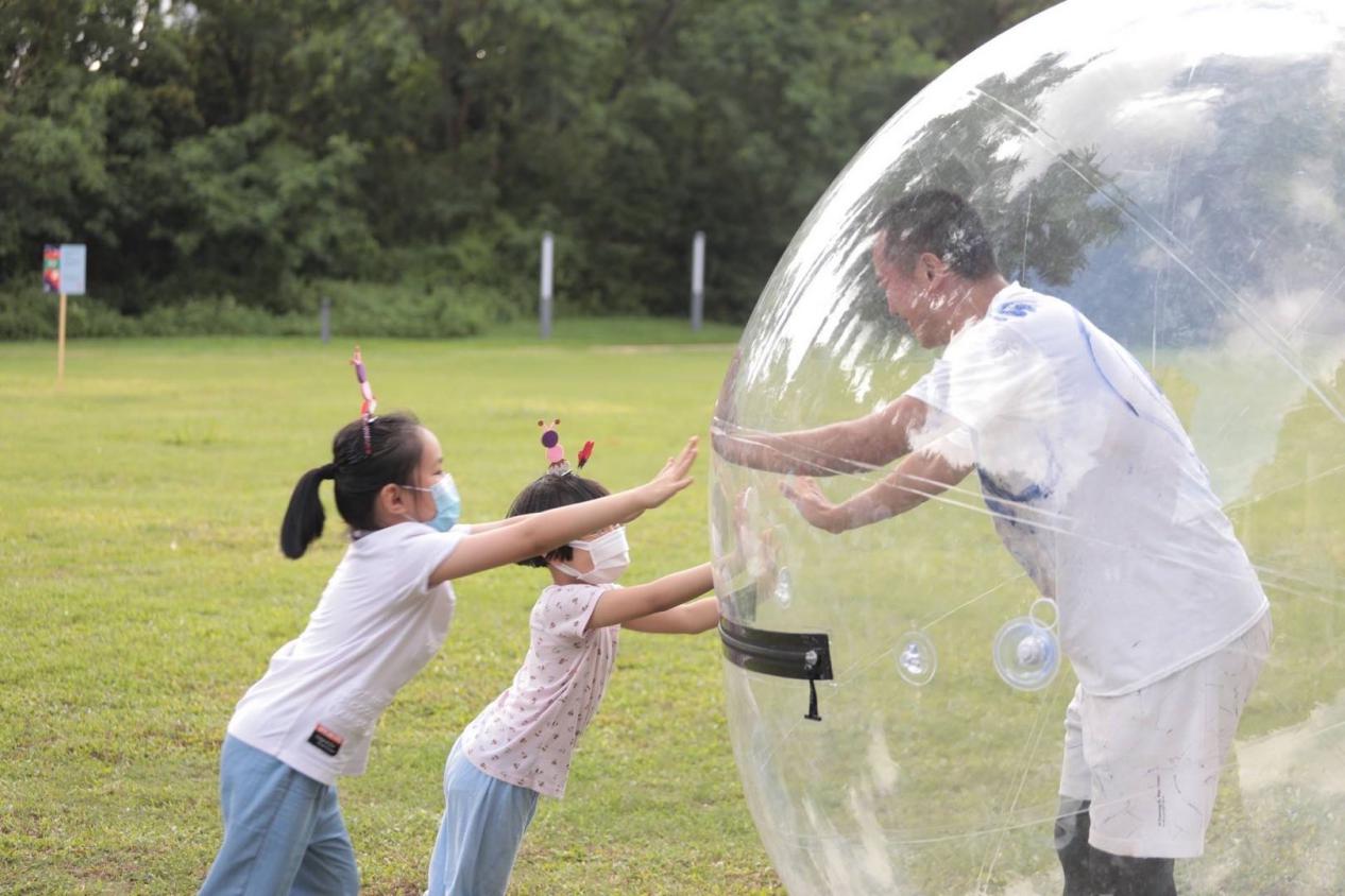 身處自然環(huán)境下,人與人之間的友好協(xié)作精神也在6月14日的環(huán)境戲劇“拋跑泡P.A.O運(yùn)動(dòng)會(huì)”中被充分展現(xiàn)。在前一天的表演藝術(shù)教學(xué)工作坊后,未接受專業(yè)體育競(jìng)技訓(xùn)練的“參賽運(yùn)動(dòng)員”們?cè)谒囆g(shù)家的引導(dǎo)下,做出自由隨性的肢體表達(dá),讓表演現(xiàn)場(chǎng)的觀者用一種特殊方式重溫了奧林匹克精神。