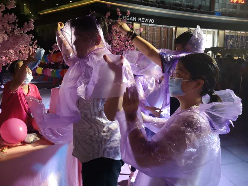 為了向疫情期間在一線戰(zhàn)斗的工作人員致敬,我們定向邀請(qǐng)了單身的醫(yī)護(hù)人員和社區(qū)工作者參與活動(dòng),并設(shè)計(jì)了“全副武裝”環(huán)節(jié)。青年朋友們穿上“防護(hù)服”,通過戴多層口罩、身披多層雨衣完成任務(wù),深刻體會(huì)一線工作人員的辛苦與不易。