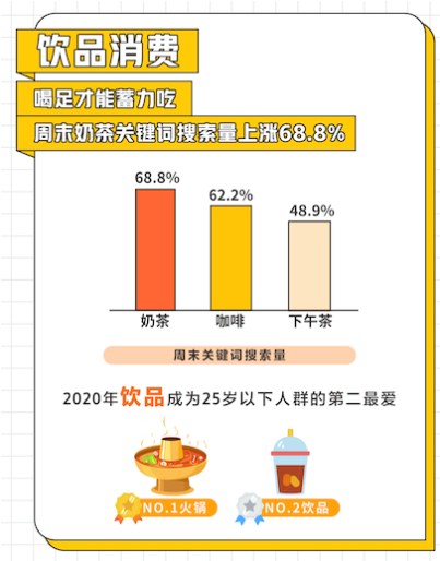 周末餐飲消費(fèi)中,在美團(tuán)點(diǎn)評,周末奶茶、咖啡關(guān)鍵詞搜索量上漲均超過60%,飲品更是成為25歲以下人群除火鍋之外的“心頭好”。