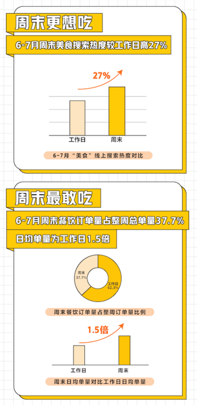 據(jù)美團(tuán)點(diǎn)評餐飲學(xué)院發(fā)布的《2020周末餐飲堂食消費(fèi)趨勢洞察》顯示,疫情恢復(fù)期,餐飲堂食消費(fèi)活力回歸,周末餐飲消費(fèi)對整個(gè)餐飲市場復(fù)蘇助力明顯。美團(tuán)6-7月線上美食搜索熱度中,周末的搜索熱度較工作日高出27%;周末餐飲線上訂單量占整周總單量的37.7%,日均單量為工作日的1.5倍。周末餐飲消費(fèi)拉動(dòng)經(jīng)濟(jì)復(fù)蘇,正在成為驅(qū)動(dòng)消費(fèi)的新引擎。