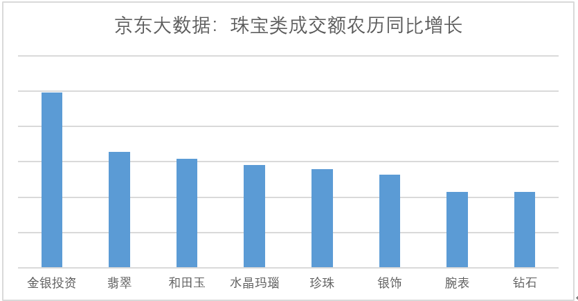 正所謂“一道鵲橋橫渺渺,千聲玉佩過(guò)玲玲”,七夕佳節(jié)之際,帶有中國(guó)傳統(tǒng)文化韻味的翡翠類珠寶最受歡迎,銷售額同比增長(zhǎng)53%,同時(shí)帶動(dòng)的還有水晶瑪瑙、珍珠、和田玉等,均有4-5成的增長(zhǎng)。