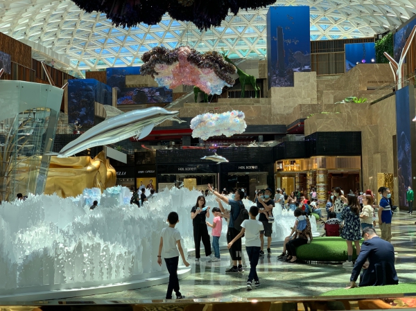 天幕廣場的飛天海馬與海豚環(huán)繞著圓柱形水族館與珊瑚互動,置身于湛藍(lán)天幕下,栩栩如生的“海洋生物”共同享受藍(lán)色海洋,透過屏幕都感受到一股清涼,絕對是今年夏天不二的親子時光的熱門打卡地。