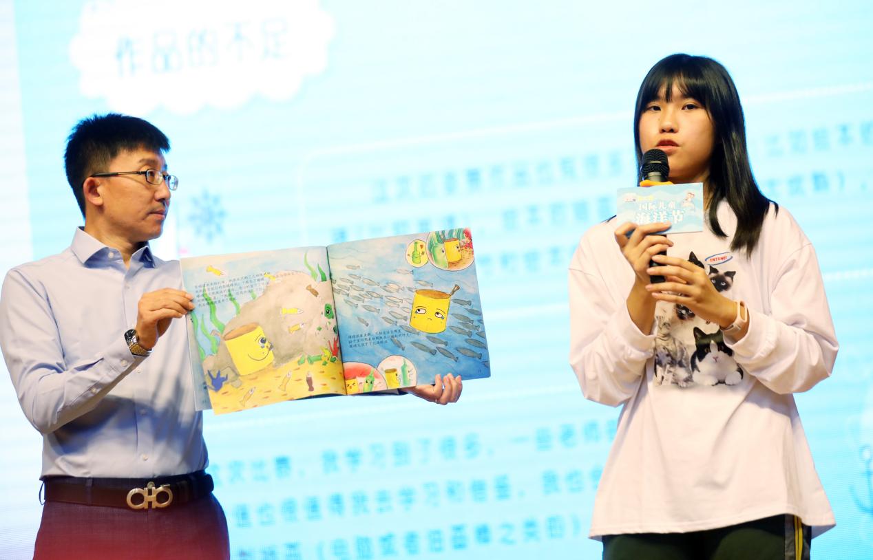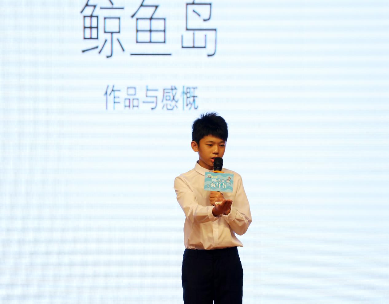 活動(dòng)現(xiàn)場(chǎng),來(lái)自南山實(shí)驗(yàn)二小6年級(jí)的由宸睿向現(xiàn)場(chǎng)觀眾分享創(chuàng)作《鯨魚(yú)島》的初衷和靈感來(lái)源。“雖然人類的環(huán)保意識(shí)逐漸加強(qiáng),但是如果只是等待黎明,何不自己沖破黑夜?”由宸睿的作品以鯨魚(yú)為切入點(diǎn),想象鯨魚(yú)通過(guò)復(fù)雜的工廠,一道道工序,把垃圾轉(zhuǎn)為燈塔的光亮,為迷失的船只指點(diǎn)方向,呼吁更多人行動(dòng)起來(lái)保衛(wèi)藍(lán)色星球。