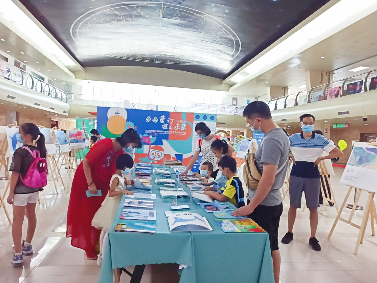 本次閉幕式活動(dòng)包括兒童海洋繪本展、公眾海洋科普講座等形式多樣的內(nèi)容。走進(jìn)少年兒童圖書(shū)館中廳,充滿了海洋氣息。