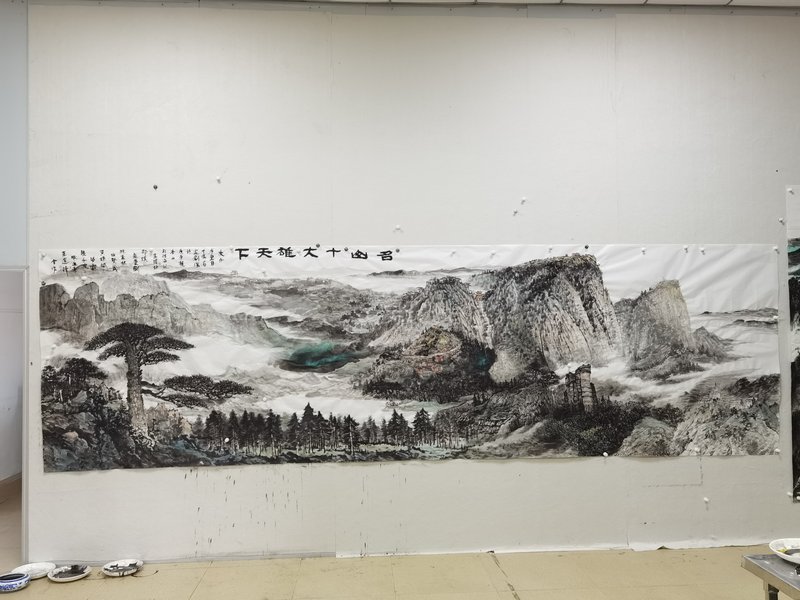 本次活動邀請的以李耀林先生為代表的十位畫家,都是當代山水畫創(chuàng)作的高手,為體現“名家繪名山”活動的創(chuàng)作意義及交流價值,十位畫家精心策劃,構思精巧地創(chuàng)作完成了一巨幅名山圖——《名山十大雄天下》。創(chuàng)作中,畫家們以各自創(chuàng)作特長及手法,將泰山、黃山、廬山、華山、五臺山、峨眉山、武夷山、武當山、長白山、觀音山十大名山的代表性景點,融于畫中,一氣呵成。鄒繼海先生在名山圖上,欣然撰序題詞“名山十大雄天下”。李耀林先生介紹到,能夠在短期內創(chuàng)作出融入十大名山精華元素的鴻篇畫作,十分講究技巧,是難得的創(chuàng)作佳話。此畫作將被名山文化與自然教育分會收藏、展出。