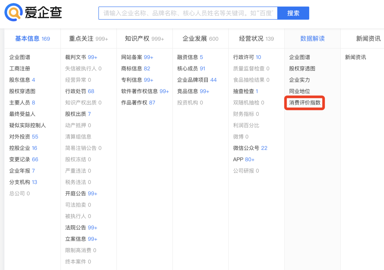 “愛企查”企業(yè)消費(fèi)評價(jià)指數(shù)查詢流程: