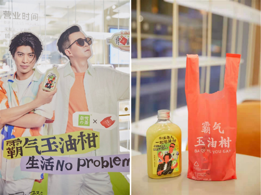 對于品牌×明星的聯(lián)名來說,調(diào)性契合是聯(lián)名活動不可或缺的"出圈基因"。而奈雪的茶霸氣玉油柑與樂隊五條人,看似來自不同次元,實則都有大膽、堅持、向上、樂觀的底色,而非將不搭嘎的兩個品牌生硬地“拉郎配”。奈雪還圍繞聯(lián)名別出心裁地推出了五條人主題的立牌、貼紙和堆頭,甚至將五條人標志性的“紅色塑料袋”做成了極具個性且生物可降解的奈雪打包袋,可謂細節(jié)之處見真章。