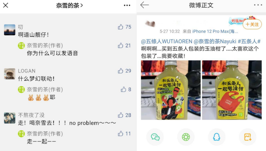 這樣“肆意妄為”的話從五條人嘴里蹦出并不稀奇,他們與生俱來的“平凡生活浪漫主義”,擅長洞察事物的另一面。精妙的是,奈雪的茶洞察到用戶在日常生活中的種種焦慮,將霸氣玉油柑“先澀后甜”的特點比作人生滋味,用這一豁達積極的態(tài)度來輕松正能量地引導,這一點與五條人的精神內(nèi)核如出一轍。5月27日奈雪的茶X五條人TVC發(fā)布后,不少網(wǎng)友表示這波是“破次元壁”的夢幻聯(lián)動,還有網(wǎng)友在線分享五條人歌曲中有共鳴的歌詞。