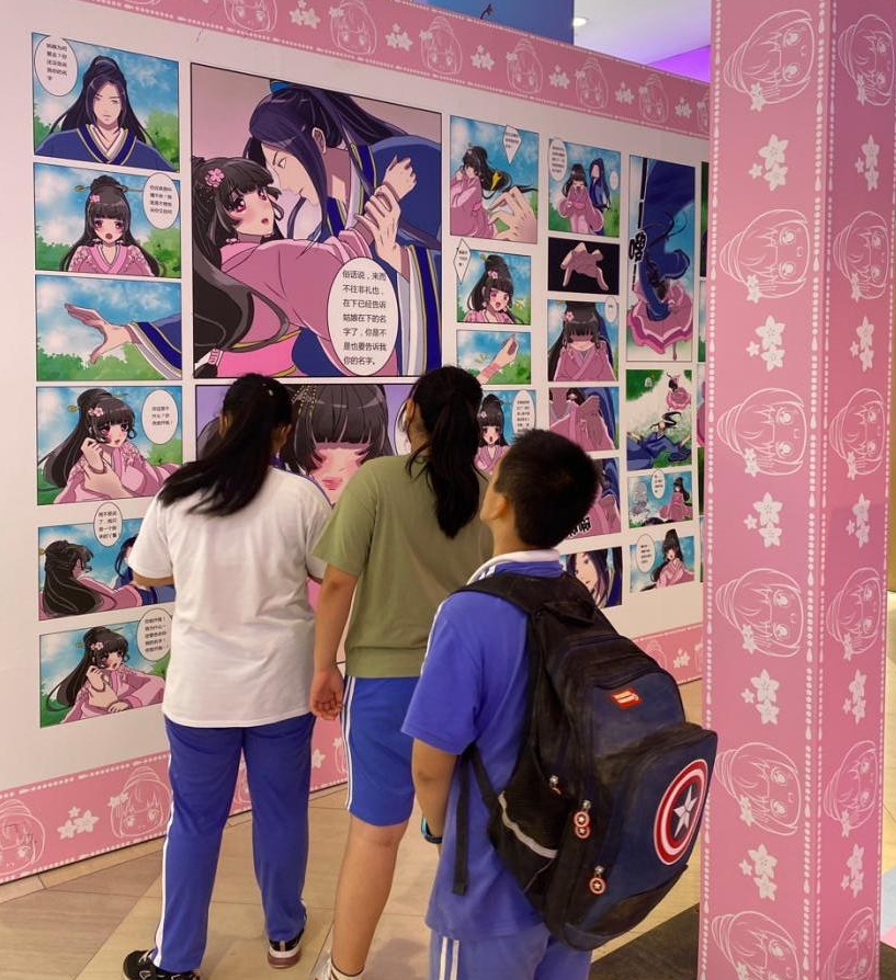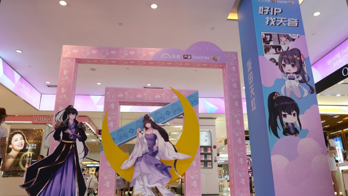 坂田天虹正門設(shè)有通靈妃打卡點,側(cè)門布置了通靈妃漫畫墻,喜歡通靈妃的小伙伴可以線下看漫畫啦!在三樓和四樓也有千云兮和夜幽冥等你來打卡哦!