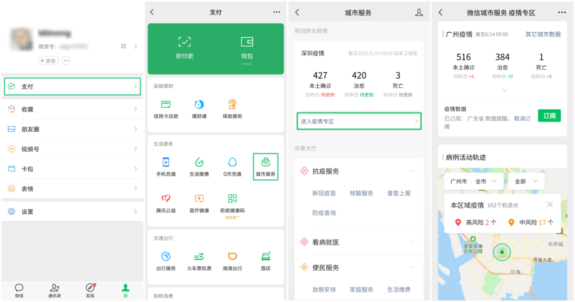 讀特客戶端·深圳新聞網(wǎng)2021年6月16日訊 (記者 田志強(qiáng))端午期間,為減少疫情傳播風(fēng)險(xiǎn),廣東市民紛紛響應(yīng)號(hào)召實(shí)行就地過節(jié),落實(shí)非必要不出省的相關(guān)要求。為進(jìn)一步助力廣東及全國人民抗疫,為市民提供準(zhǔn)確疫情資訊及抗疫服務(wù),近日,微信更新城市服務(wù)疫情專區(qū),支持查看疫情數(shù)據(jù)、病例活動(dòng)軌跡、疫情資訊以及接入抗疫服務(wù)。全國用戶打開“我-支付-城市服務(wù)-疫情專區(qū)”,即可快速觸達(dá)各類疫情相關(guān)服務(wù)。