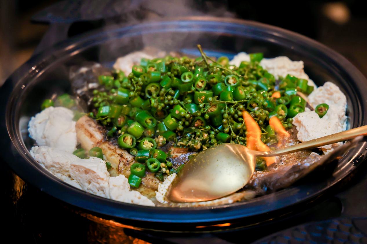 除了視覺感官外,探魚全新lab店的產(chǎn)品完全顛覆了探魚以往的產(chǎn)品結(jié)構(gòu)和產(chǎn)品體驗,所有的產(chǎn)品都以“極致釋放”為準(zhǔn)則,涼菜更冰爽,熱菜更火熱,更高的顏值、味道更加的讓人印象深刻,有好玩、驚喜的感覺。探魚的經(jīng)典產(chǎn)品“鮮青椒烤魚”也在lab店有口味上和形式上的升級,味道上加重了核心的“爽麻”的口感,上菜形式也增加了添酒增香、點火炙烤等充滿儀式感的內(nèi)容。提高菜品品質(zhì)的同時,也使顧客擁有了更別致的用餐體驗。