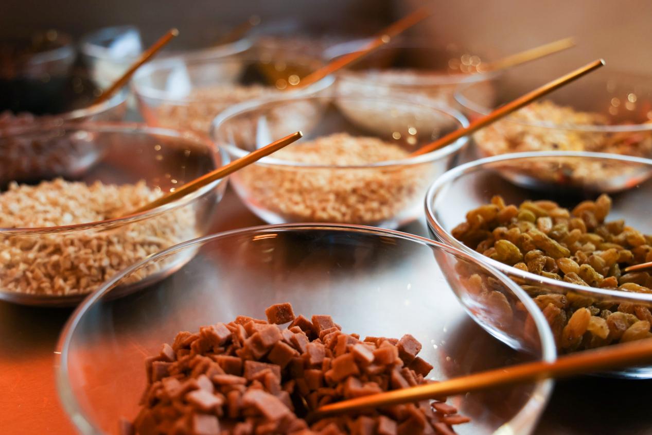 除了產(chǎn)品口味、形式上的革新,探魚的lab店還新增了“DIY”專區(qū)。茶水、水果、涼菜、冰粉都可以在DIY區(qū)根據(jù)自己的口味隨意搭配,增加了消費者在用餐過程中的可玩性。值得一提的是,探魚的DIY冰粉取消了目前市場中常見的或固定或多樣的搭配方式,為消費者提供了3種冰粉基底,18種各色配料,搭配方式和用量全部由消費者自己選擇。不同口味質(zhì)地的配料為消費者提供了至少17000+種配比方式,這樣的設(shè)置潛在性地增加了用餐的社交功能,在整個就餐過程中,消費者被擁有了“體驗者”與“傳播者”的功能性身份,擁有了一場“就餐+游戲”的個性體驗。