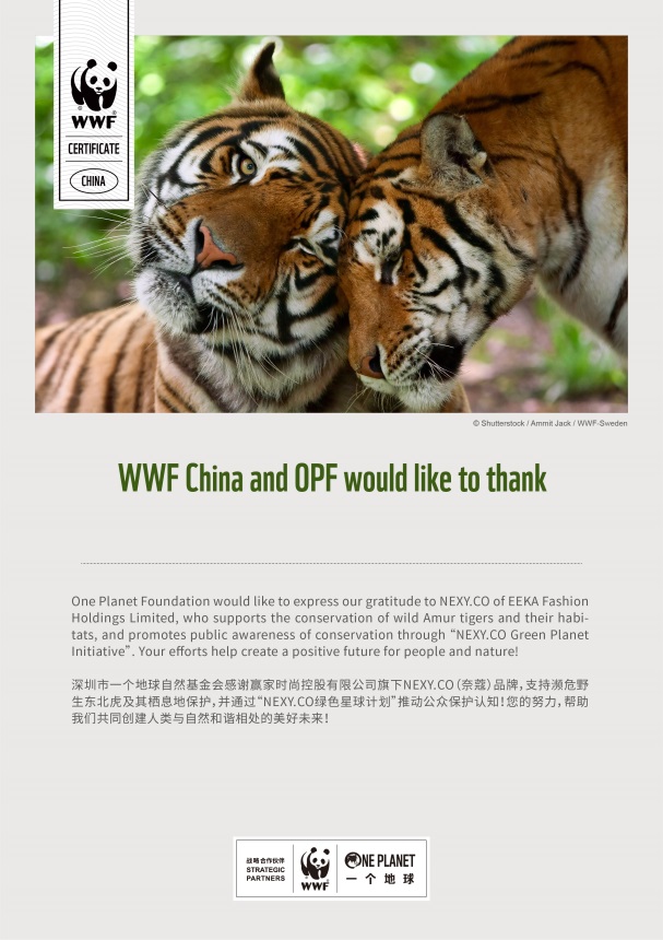 2021年,NEXY.CO攜手WWF(世界自然基金會(huì))和OPF(一個(gè)地球自然基金會(huì))共同推出2021SS 【綠色星球】公益環(huán)保系列,踏出了綠色環(huán)保公益的關(guān)鍵一步。 NEXY.CO通過(guò)WWF和OPF,特別捐贈(zèng)款項(xiàng)用于支持野生東北虎及其棲息地的專項(xiàng)保護(hù),呼吁大家關(guān)注瀕危野生動(dòng)物及其棲息地保護(hù),喚醒人們對(duì)自然的關(guān)愛(ài)。