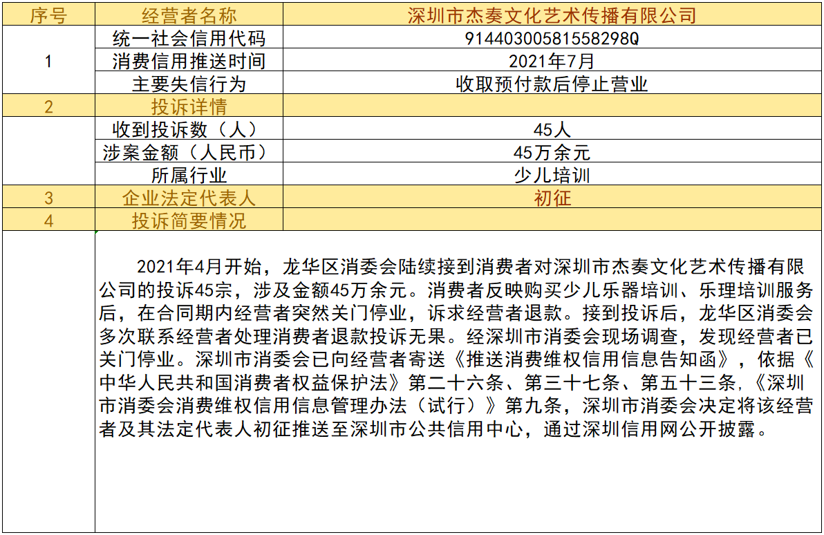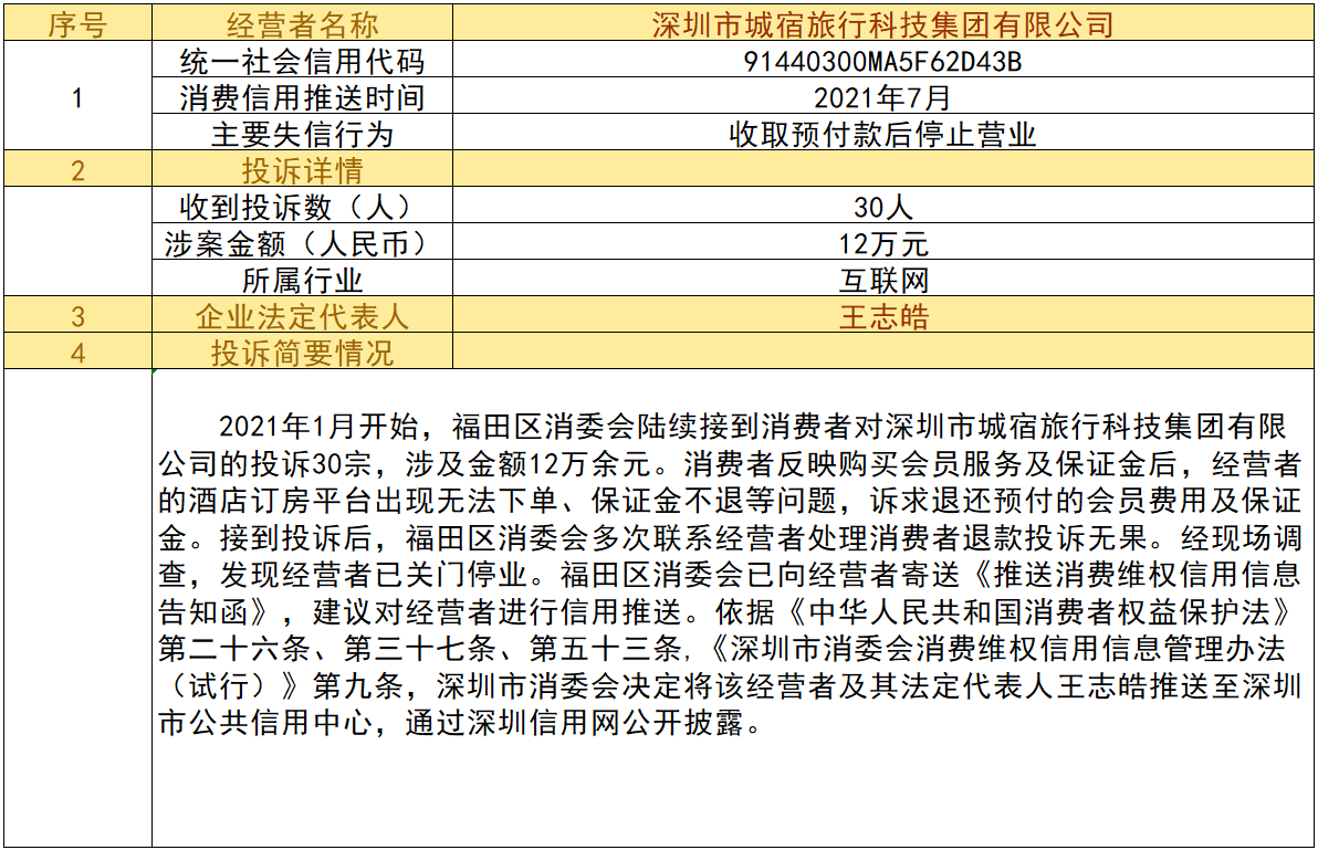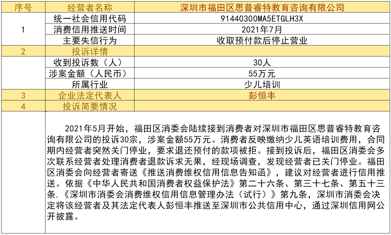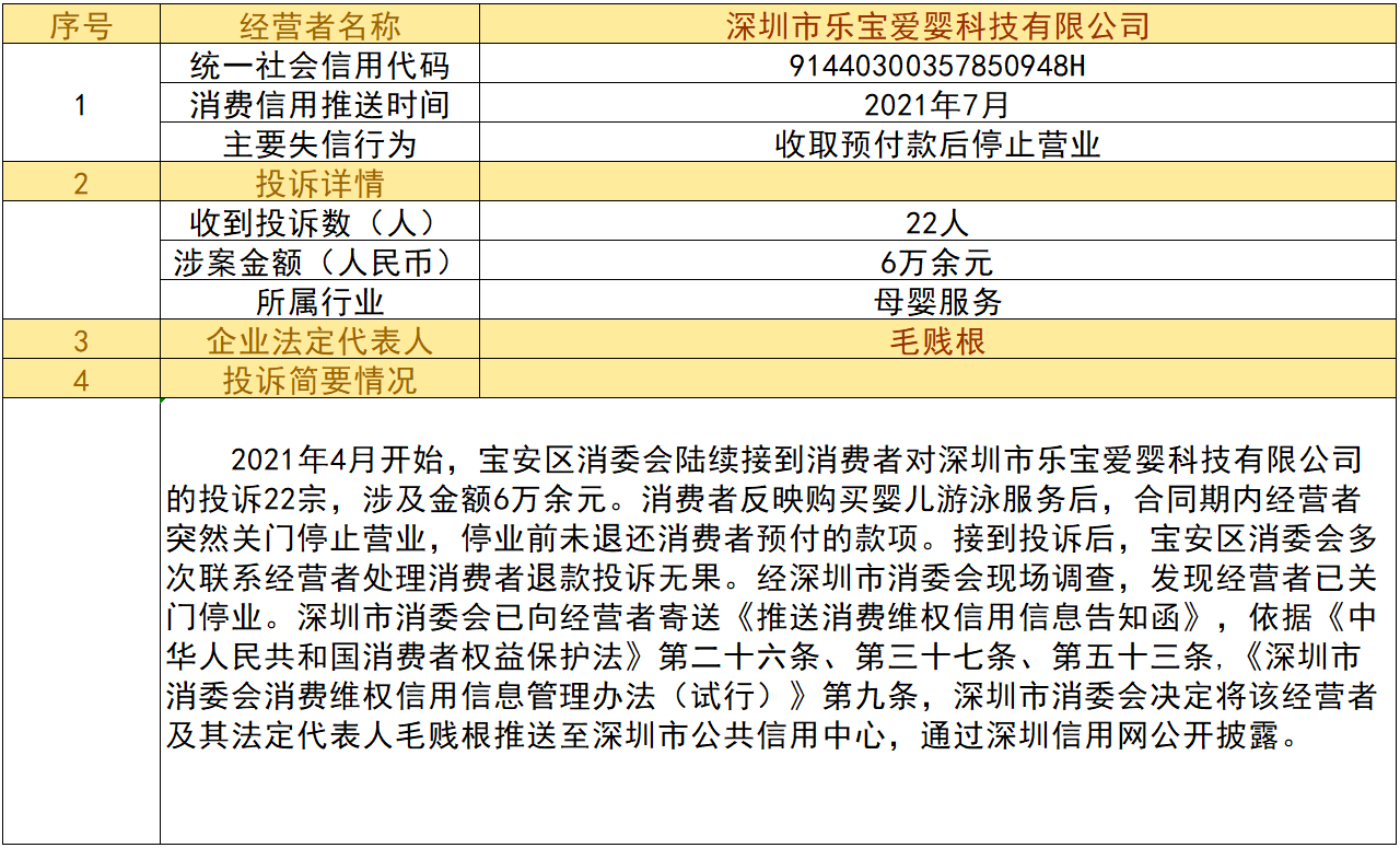 近日,深圳市消委會將九家“跑路”、未按約定退還消費者預(yù)付款項的經(jīng)營者及其主要負責(zé)人推送至深圳市公共信用中心,失信經(jīng)營者信息信息將通過深圳信用網(wǎng)公開披露。