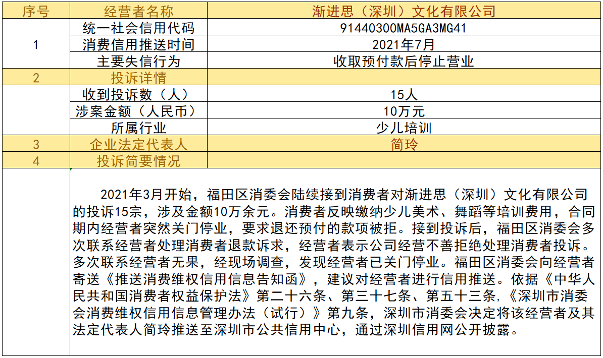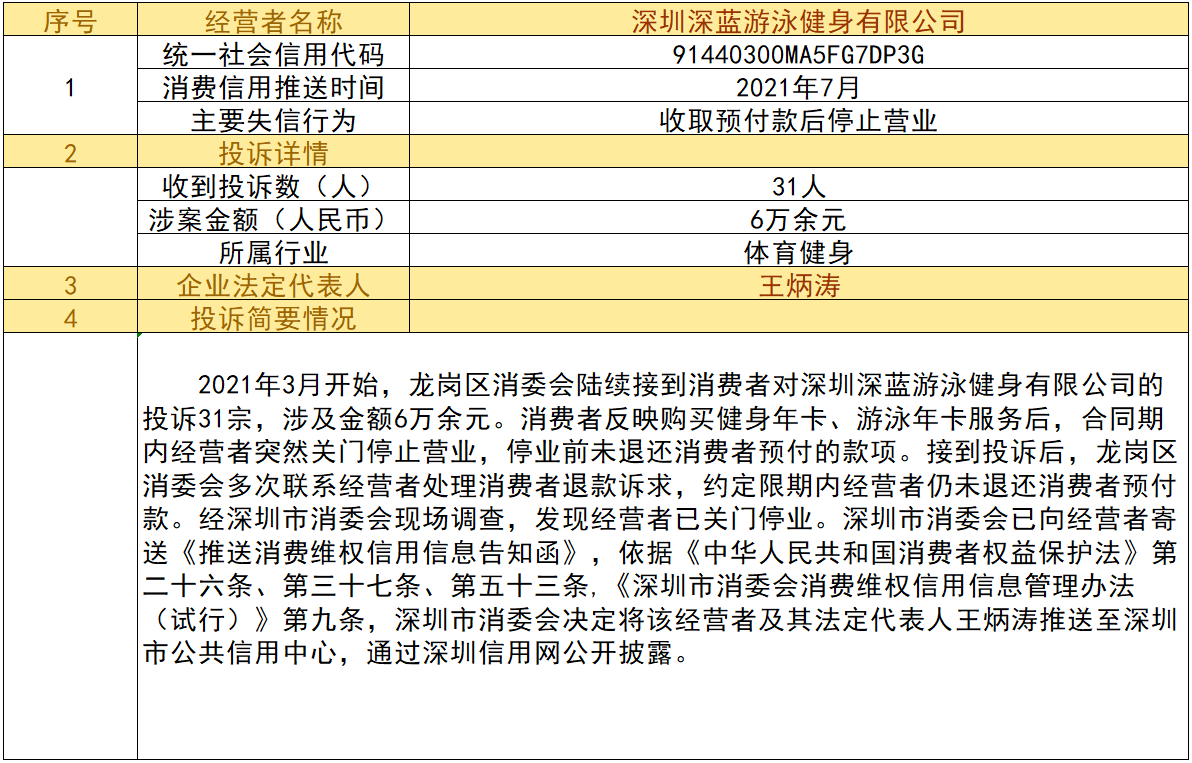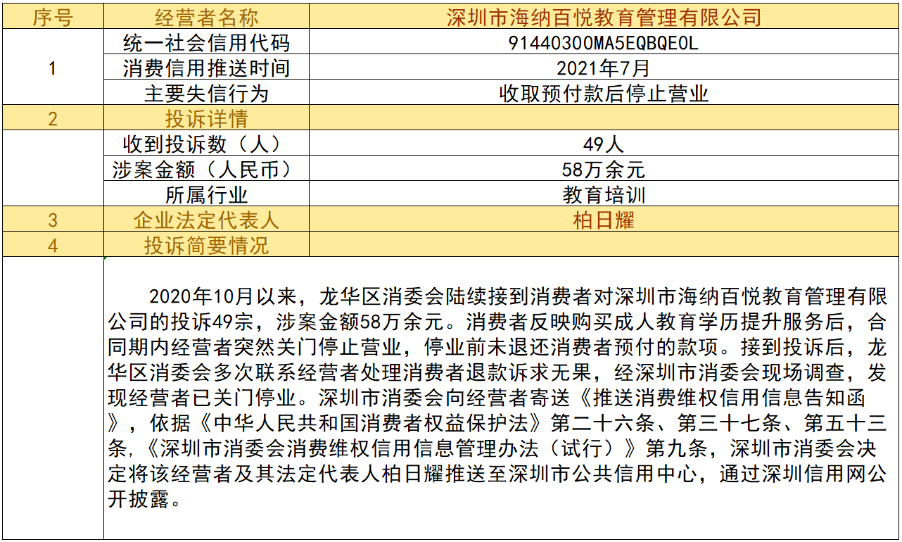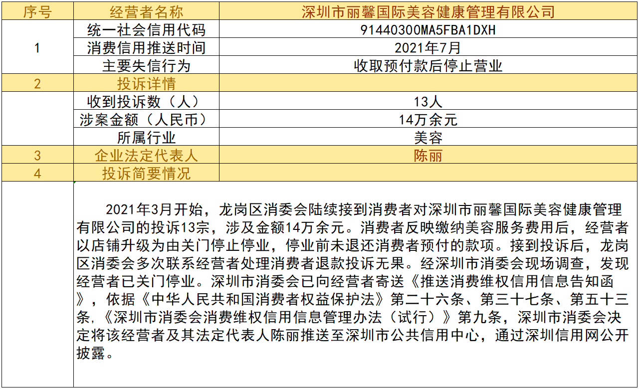 近日,深圳市消委會將九家“跑路”、未按約定退還消費者預(yù)付款項的經(jīng)營者及其主要負責(zé)人推送至深圳市公共信用中心,失信經(jīng)營者信息信息將通過深圳信用網(wǎng)公開披露。