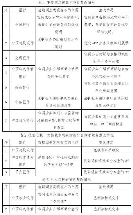 中國(guó)銀行、交通銀行、中國(guó)郵政儲(chǔ)蓄銀行、招商銀行等銀行完善了官網(wǎng)信用卡分期業(yè)務(wù)實(shí)際年化費(fèi)率的披露; 中國(guó)銀行、中國(guó)建設(shè)銀行、中信銀行、中國(guó)民生銀行等銀行完善了撤銷分期、提前還款規(guī)則等重要信息的披露;中國(guó)建設(shè)銀行、中國(guó)郵政儲(chǔ)蓄銀行、平安銀行針對(duì)消費(fèi)者提前還款,由原先一次性須收取剩余所有各期手續(xù)費(fèi),修改為免收剩余手續(xù)費(fèi)或僅收取一定比例違約金;中國(guó)農(nóng)業(yè)銀行、中國(guó)郵政儲(chǔ)蓄銀行、中國(guó)民生銀行刪除了“免利息”“手續(xù)費(fèi)比例不隨分期期數(shù)的增長(zhǎng)而提高”等容易引起消費(fèi)者誤解的宣傳語(yǔ)。各銀行存在問(wèn)題及整改情況如下: