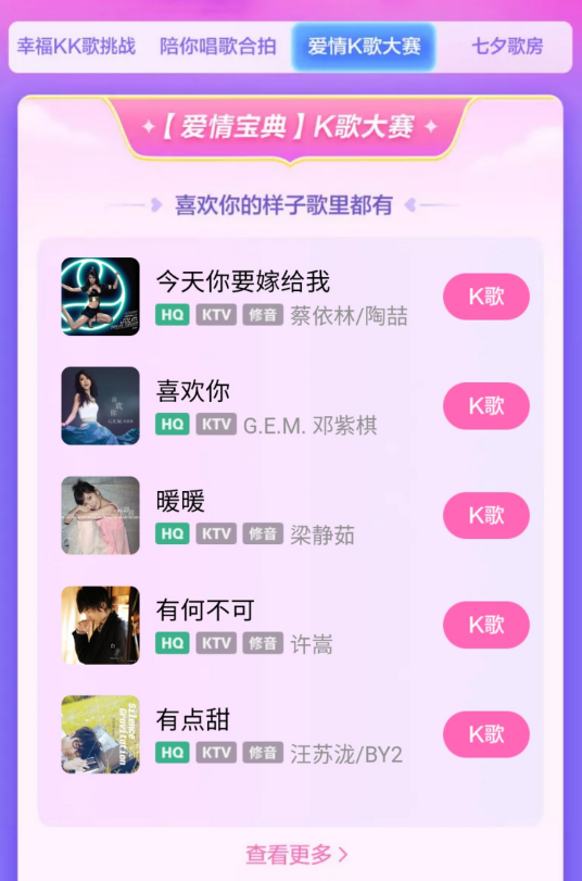 此次活動(dòng)的主題曲《幸福KK歌》改編自著名歌謠《幸福拍手歌》,喜歡手勢(shì)舞蹈的朋友可以嘗試“幸福KK歌”親密挑戰(zhàn),只要按照示例視頻演唱歌曲并完成5個(gè)指定動(dòng)作,發(fā)布視頻即挑戰(zhàn)成功;而對(duì)于喜歡對(duì)唱的人,可以選擇“陪你唱歌”心動(dòng)合拍大賽,在合唱模板中,pick讓你心動(dòng)的小哥哥/小姐姐,發(fā)布與TA的合唱即算挑戰(zhàn)成功;“情歌王”們則可以來(lái)「愛(ài)情寶典」K歌大賽一展歌喉,演唱官方七夕主題歌單中的歌曲,人氣排名前10的優(yōu)秀用戶(hù)也能獲得獎(jiǎng)勵(lì);還有七夕歌房任務(wù)限時(shí)開(kāi)啟,完成七夕歌單演唱、“一起聽(tīng)”情歌、七夕“話題熱聊”任務(wù),即可獲得“七夕大聲愛(ài)”“加油鴨”等道具禮物。