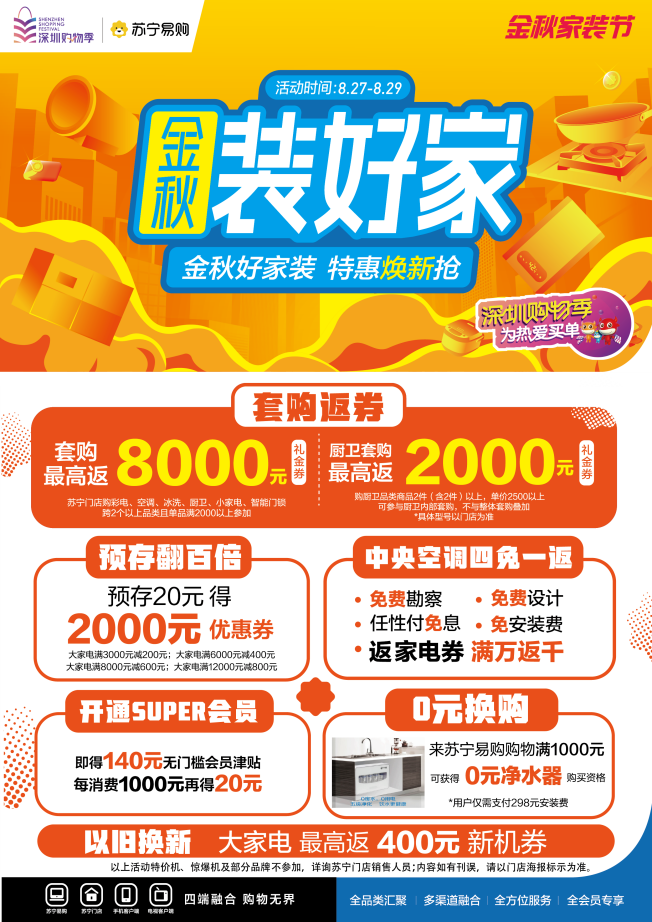 為了解決業(yè)主們的家裝問題,蘇寧易購(gòu)于8月27日至8月29日啟動(dòng)廚衛(wèi)·金秋家裝節(jié),為近期需要對(duì)廚房進(jìn)行改造的業(yè)主,或是剛收新房的新業(yè)主,提供專業(yè)的廚衛(wèi)設(shè)計(jì)以及合適的廚衛(wèi)產(chǎn)品推薦;并且在活動(dòng)期間,來蘇寧易購(gòu)門店,購(gòu)買兩件以上廚衛(wèi)產(chǎn)品,且單價(jià)在2500元以上,即可參與廚衛(wèi)套購(gòu)活動(dòng),最高返2000元禮金券,還有以舊換新補(bǔ)貼以及0元換購(gòu)活動(dòng),來門店購(gòu)買如 A.O.史密斯等廚衛(wèi)產(chǎn)品,滿1000元即可0元換購(gòu)凈水器,消費(fèi)者僅需支付298元的安裝費(fèi)。并且凡在8月27日至9月12日間在蘇寧易購(gòu)門店購(gòu)買方太、老板、美的、 COLMO、西門子品牌的洗碗機(jī),消費(fèi)者將免費(fèi)獲得櫥柜局部升級(jí)改造活動(dòng)。
