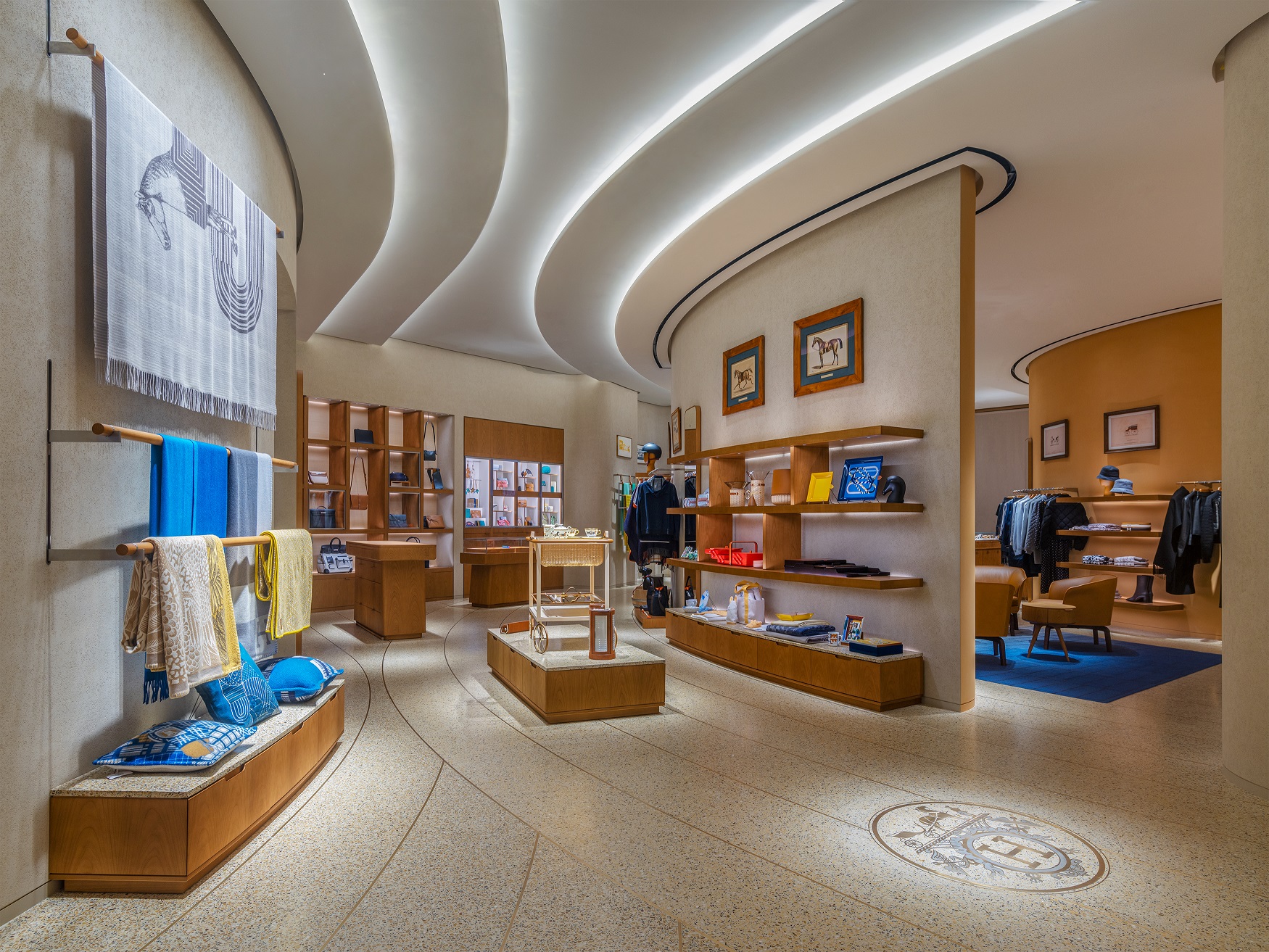 優(yōu)雅的專賣店空間由巴黎建筑事務(wù)所RDAI精心打造,并根植于品牌傳承精髓,將現(xiàn)代極簡(jiǎn)主義風(fēng)格與源自本地的傳統(tǒng)工藝巧妙結(jié)合。賓客從正門步入店內(nèi),愛馬仕標(biāo)志性希臘式琉璃球頂燈的柔光傾瀉而下,與地面上黃銅裝飾的藏書章標(biāo)志遙相呼應(yīng),不同區(qū)域間流暢銜接,整體空間皆可被賓客盡收眼底。絲巾區(qū)域陳列著各式豐富色彩的印花絲巾;與之相鄰的美妝區(qū)域則歡迎賓客在此盡情體驗(yàn)RougeHermès唇妝系列。
