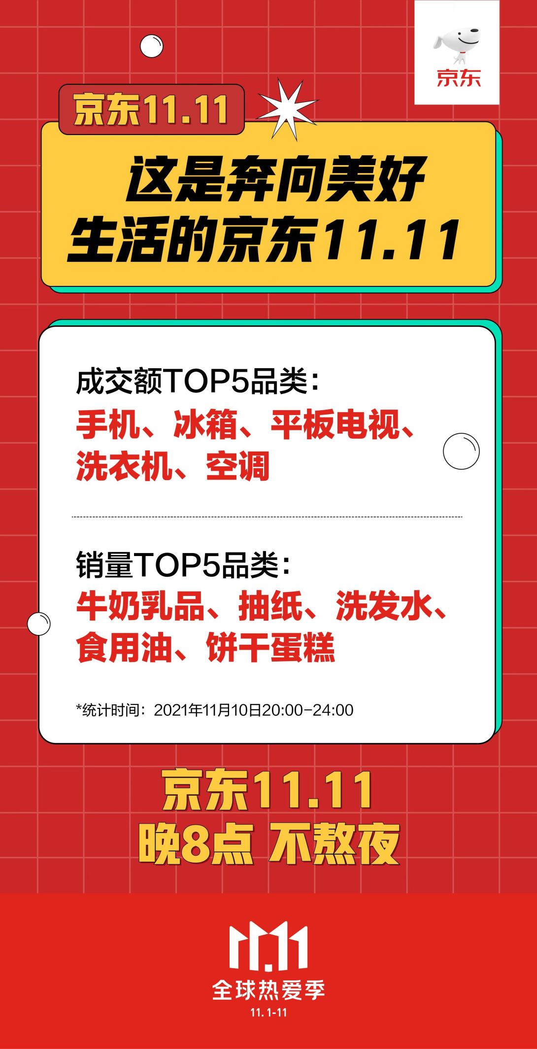 從10日晚8點到11日0點短短4小時內,可以看到消費者對美好生活的向往和對消費升級的追求。其中成交額TOP5品類:手機、冰箱、平板電視、洗衣機、空調;銷量TOP5品類:牛奶乳品、抽紙、洗發(fā)水、食用油、餅干蛋糕。