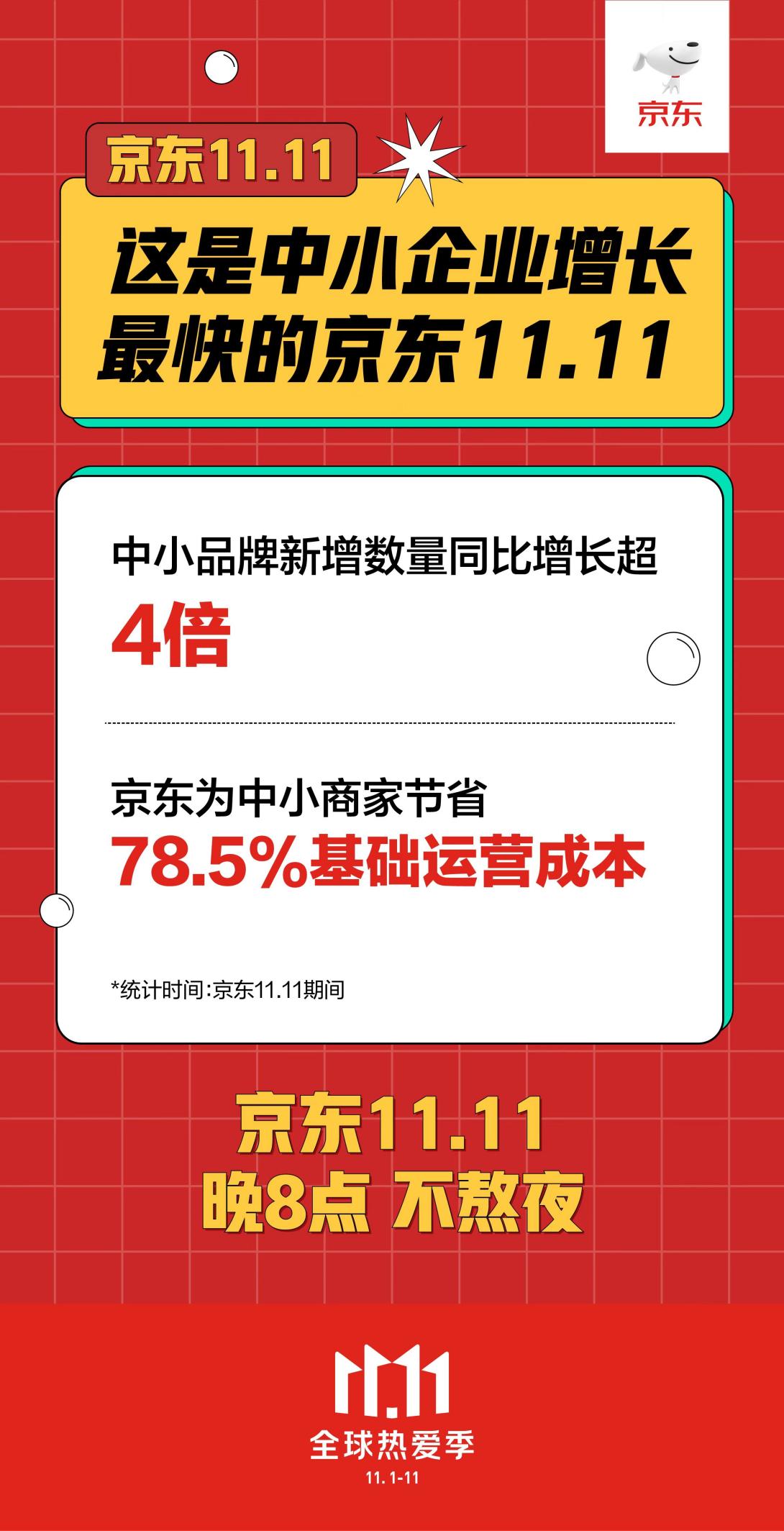 這是中小企業(yè)成長最快的京東11.11,中小品牌新增數(shù)量同比增長超4倍,京東為中小商家節(jié)省78.5%的基礎運營成本。以氣彈茶飲料為主打的“果子熟了”品牌為例,參與京東小魔方新品日的1小時內,成交額便同比提升500%,訪客數(shù)環(huán)比提升500倍。